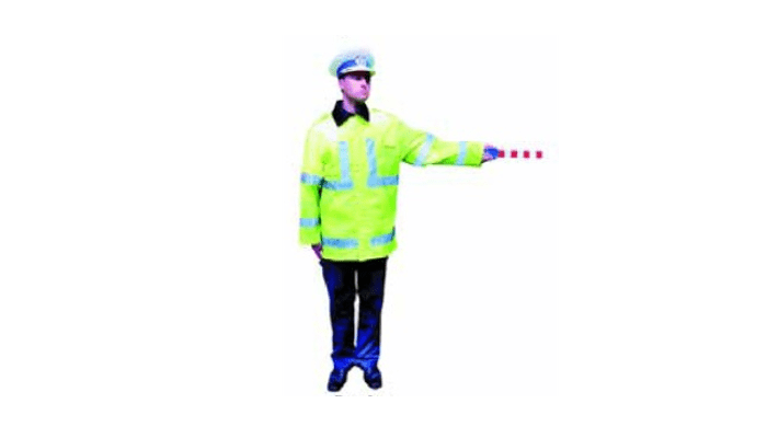 Brațele polițistului rutier întinse orizontal înseamnă "Oprire!" pentru toți participanții la trafic care, indiferent de de sensul lor de mers, circulă din direcțiile intersectate de brațele întinse.